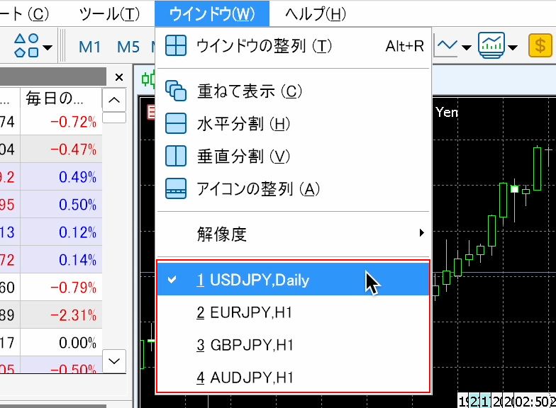 チャートバーが非表示のときは、メニューの「ウィンドウ」の部分でチャートの選択を切り替えることができます。
