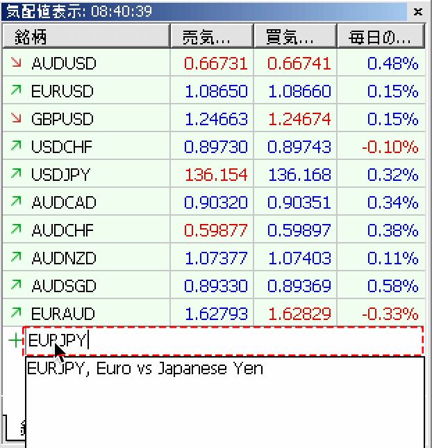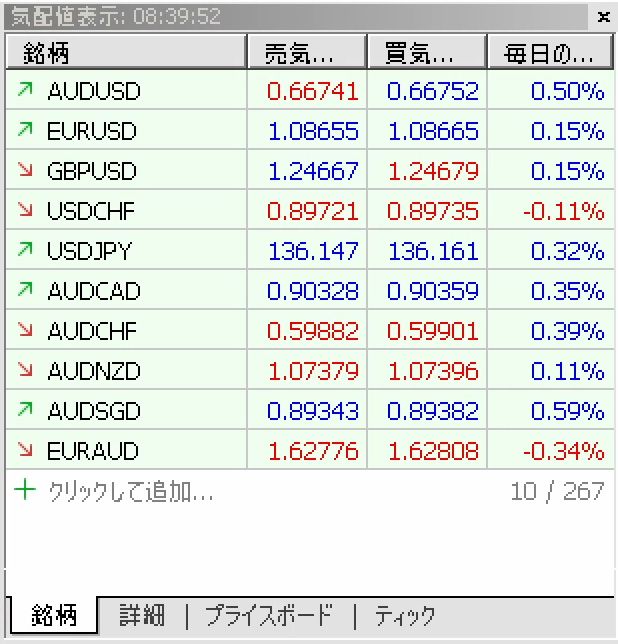 気配値表示に表示する銘柄は必要に応じて、追加、削除することができます。必要ない銘柄は非表示にしておいた方が、PCへの負担を軽減することもできるので、必要に応じて調整してください。