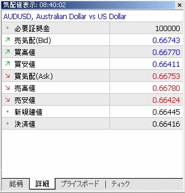 気配値表示の銘柄タブに表示する項目は売気配(Bid)、買気配(Ask)の他にも高値、安値、変化率やスプレッド等の任意の項目を表示することができます。