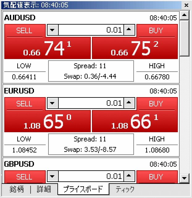 各銘柄のプライスボード(取引パネル)を表示することができます。