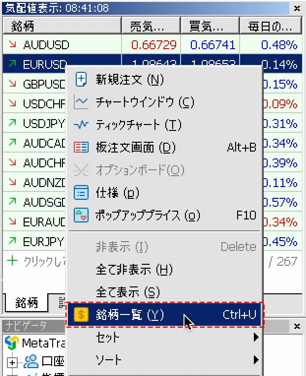 MT5では、ここに表示されている銘柄のチャートを表示することができます。また、新規チャートの表示やチャートの銘柄の変更もここから行うことができます。