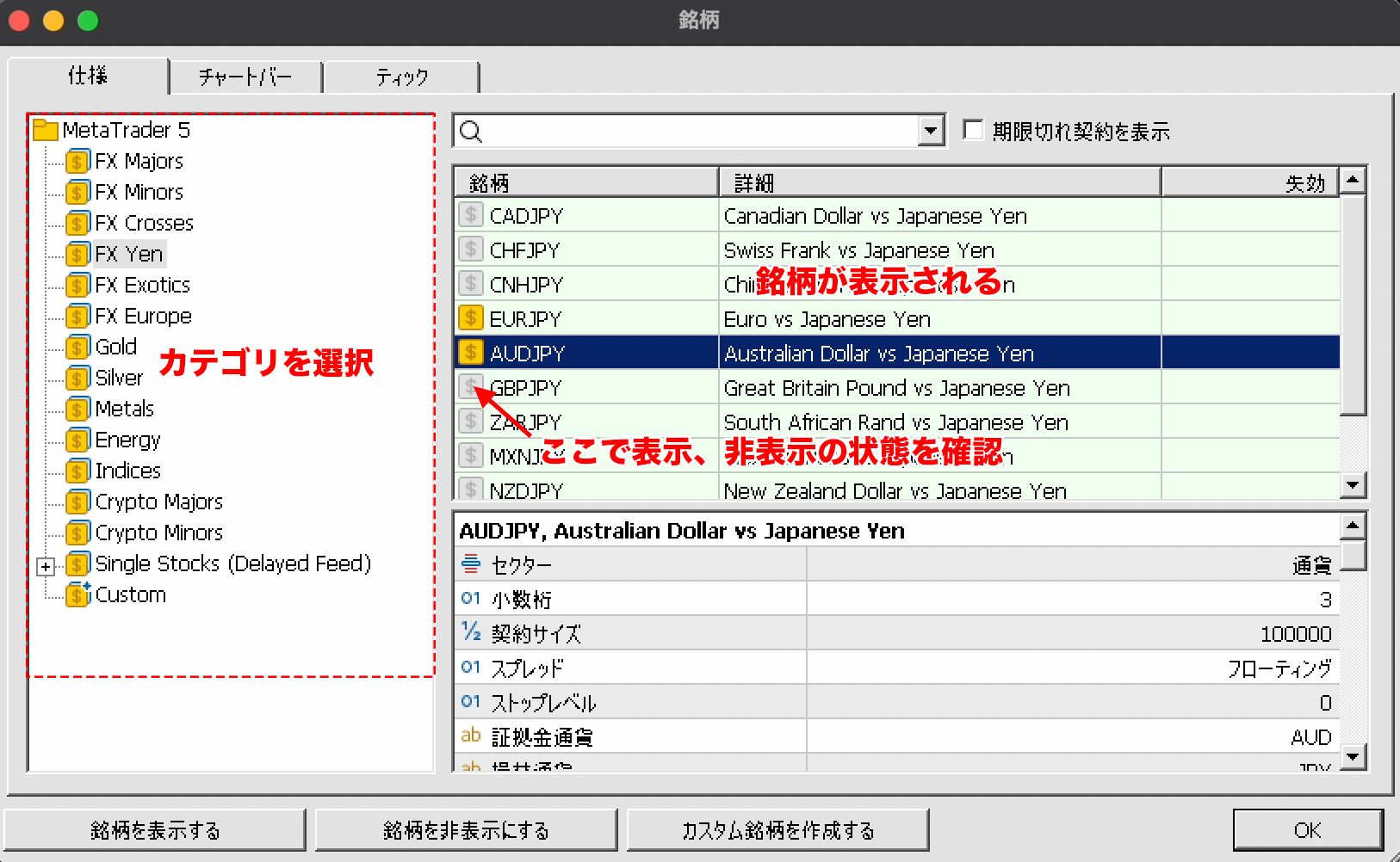 表示される「銘柄」ダイアログ内で、左側のカテゴリを選択すると、カテゴリ内の銘柄が右に表示されるため、表示したい銘柄を選択し、下の「銘柄を表示する」、「銘柄を非表示にする」ボタンをクリックし、表示、非表示を切り替えることができます。(銘柄名の上でダブルクリックしても表示/非表示を切り替えることができます。)