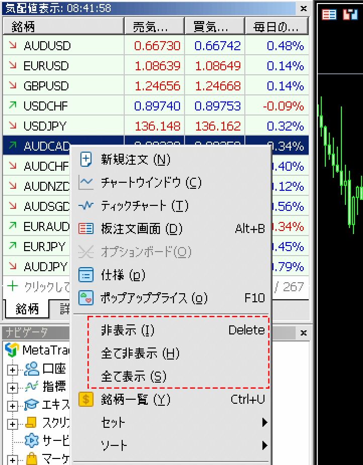 また、右クリックし表示されるメニューから「全て表示」を選択すると、表示できる銘柄全てを表示し、「全て非表示」を選択すると、チャート等で使用している銘柄を除き、全てを非表示にすることができます。