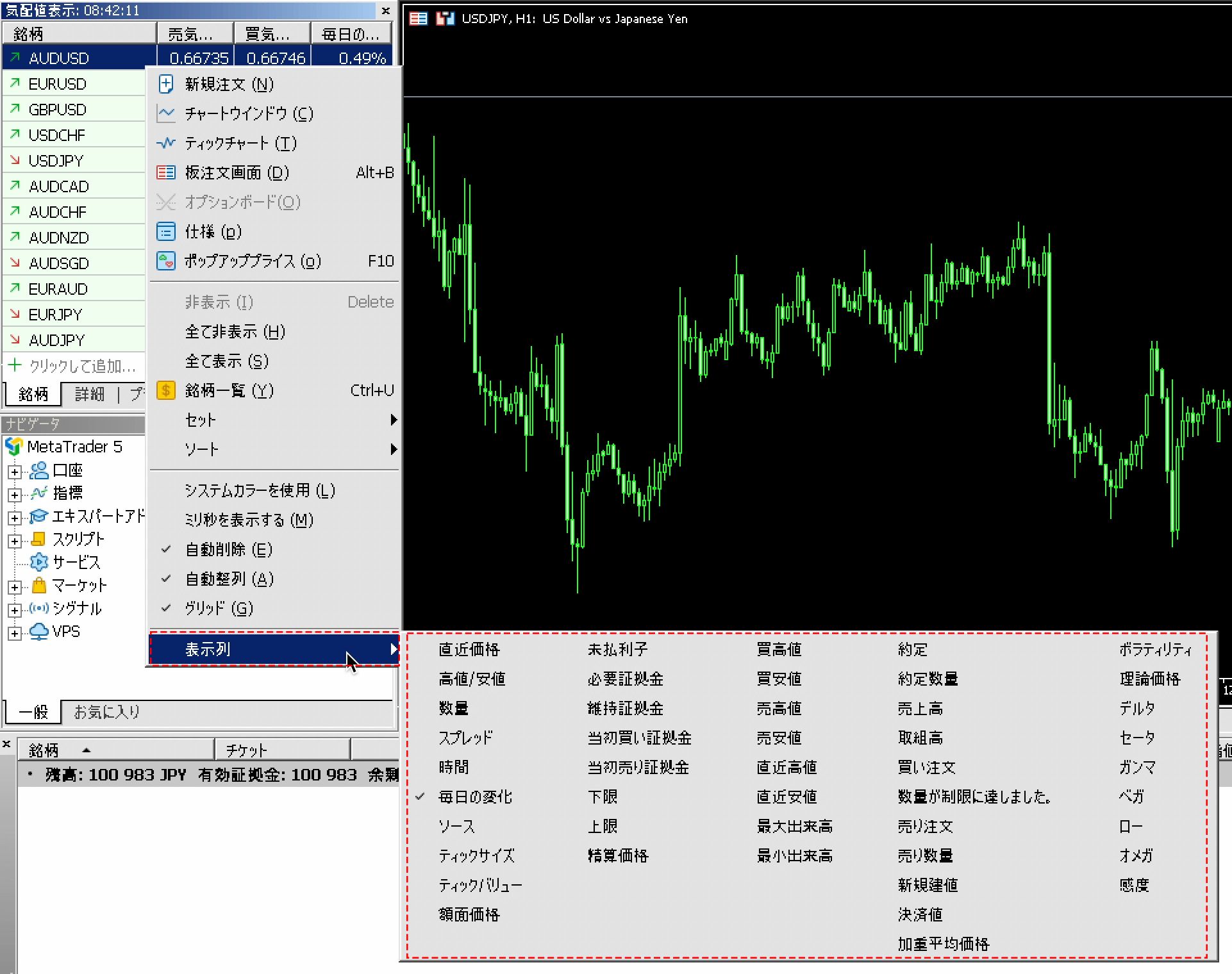 調整方法は、気配値表示上で右クリックし、表示列内で表示したい項目にチェックを入れます。