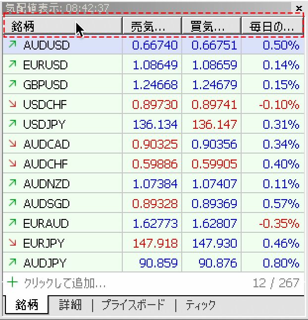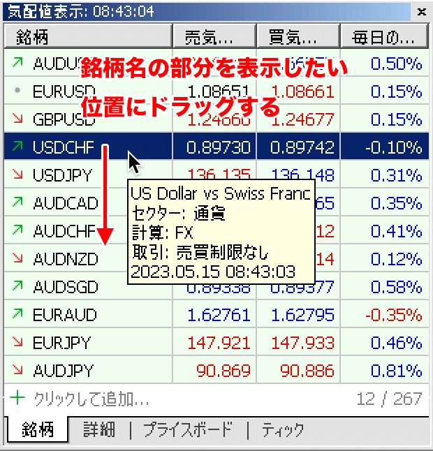 上記のソートがかかっていない状態(ソートがかかっている場合は、ソートを解除する必要があります。)で、気配値表示上で銘柄名を上下にドラッグ&ドロップすると、表示の順番を変更することができます。