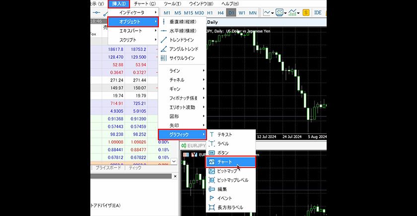 ミニチャートを表示したいチャートを選択した状態で、メニューの「挿入」内の「オブジェクト」→「グラフィック」→「チャート」を選択します。