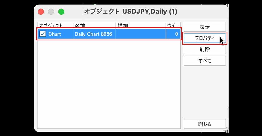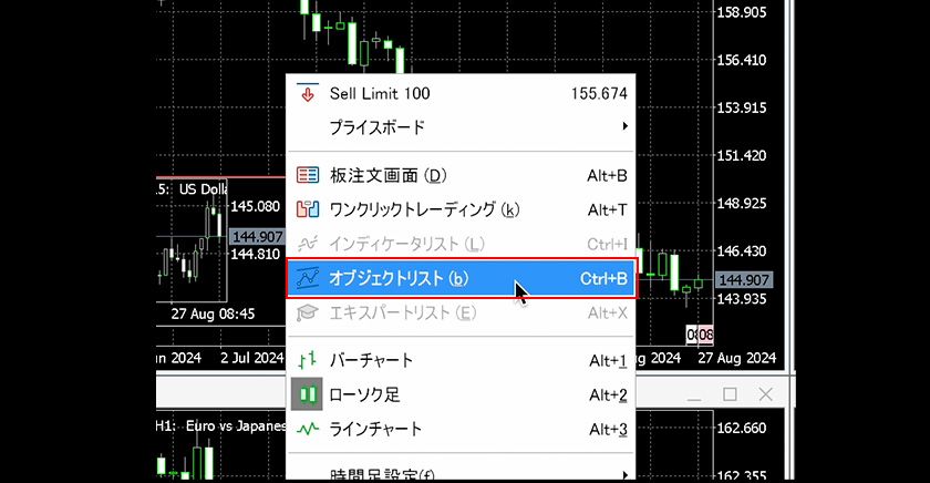チャート上で右クリックし、「オブジェクトリスト」を選択します。