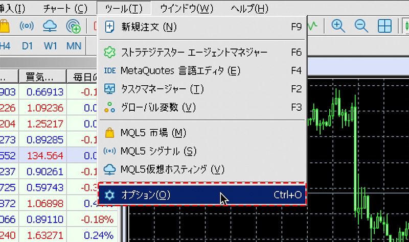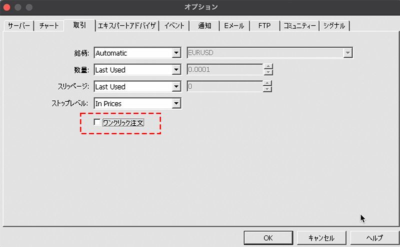 ② オプション画面の一番下の「ワンクリック注文」にチェックを入れます。
