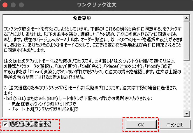 ③ ワンクリック注文の免責事項が表示されるので、内容を確認し、「規約と条件に同意する」にチェックを入れて「OK」をクリックします。