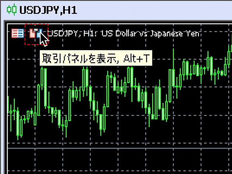 取引パネルが表示されていない場合は、チャート左上の取引パネルアイコンをクリックすると、表示することができます。