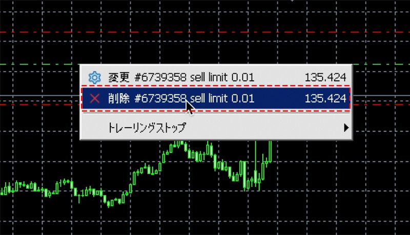 指値、逆指値注文をキャンセルしたい場合は、チャート上の指値、逆指値注文を示すライン上で右クリックし、表示されるメニューから「注文の取消」を選択します。付随する決済注文のみをキャンセルしたい場合は、それぞれのラインの上で「T/Pをキャンセル」、または「S/Lをキャンセル」をクリックすると、キャンセルできます。