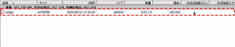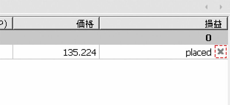 また、ツールボックス内の「取引」タブ内の右端の×ボタンをクリックすると、注文をキャンセルすることができます。