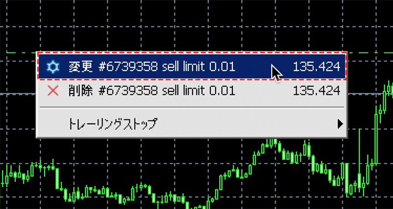 MT5では、注文中の指値・逆指値の価格の水準、付随する決済の指値、逆指値注文を追加、修正、削除する等の変更を行うことができます。