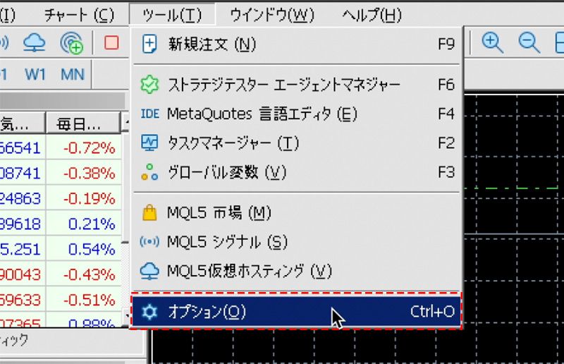 MT5のメニューの「ツール」から「オプション」を選択します。
