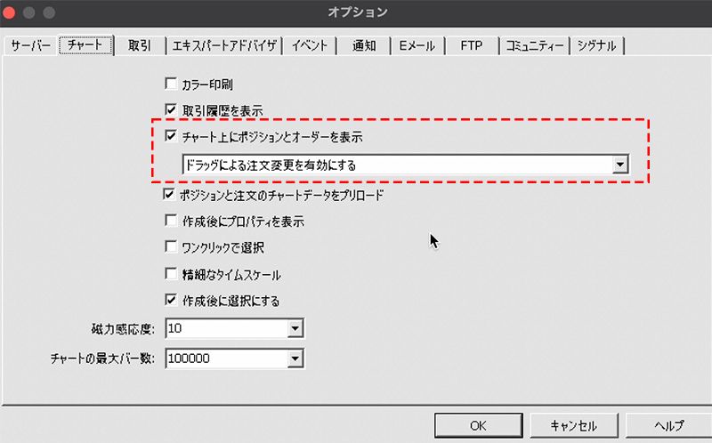 表示されるオプションウィンドウの「チャート」タブ内の「チャート上にポジションとオーダーを表示」にチェックを入れます。また、下のプルダウンがドラッグによる注文変更を有効にするになっていることを確認します。