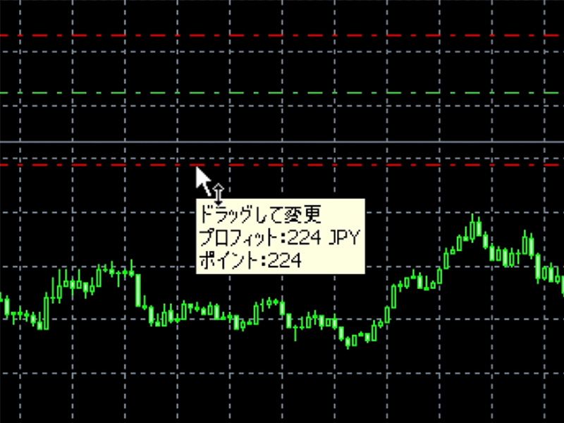 指値、逆指値注文を示すラインから、修正したい水準までドラッグすると、価格を変更することができます。付随する注文がある場合は、付随する注文も同じ間隔分移動します。