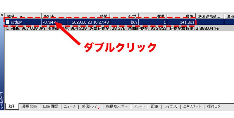 ツールボックス内の「取引タブ」内の部分決済したいポジションの上でダブルクリックします。