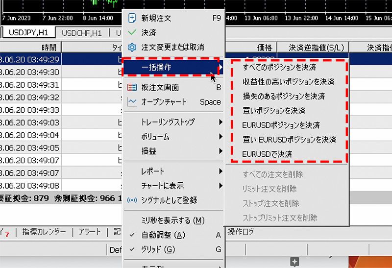 ツールボックス内の「取引タブ」内の決済したいポジションの上で右クリックし、表示されるメニュー内の「一括操作」内から行いたい処理を選択します。