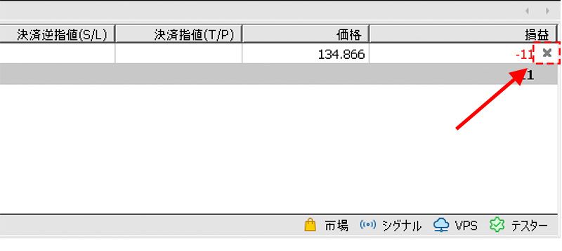 ツールボックス内の「取引タブ」内の決済したいポジションの右端の「×」ボタンをクリックすると決済されます。