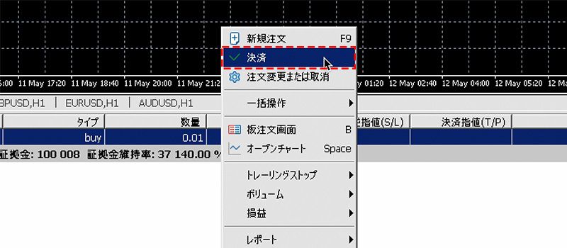ツールボックス内の「取引タブ」内の決済したいポジションの上で右クリックし、「決済」を選択すると、決済されます。