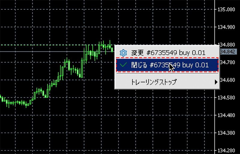 チャート上のポジションを示すライン上でポジションや決済注文を示すライン上で右クリックし、表示されるメニューから「閉じる」を選択すると表示されます。