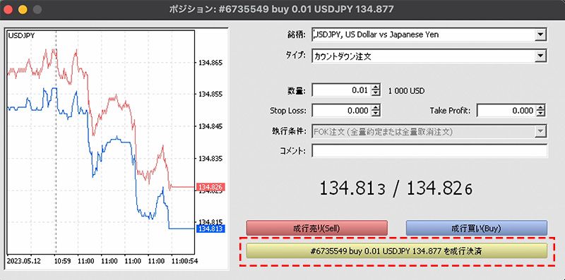 表示されるポジションウィンドウ内の黄色い成行決済のボタンをクリックすると決済が完了します。