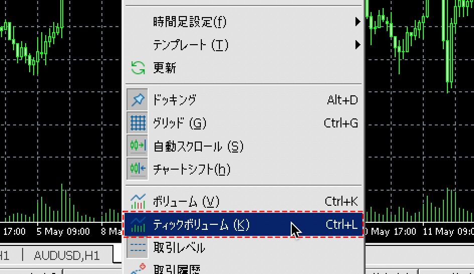 チャート上で右クリックし、表示されるメニューから「ティックボリューム」をクリックすると、ティックボリュームの表示、非表示を切り替えることができます。
