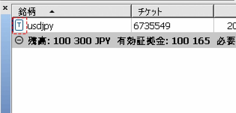 トレーリングストップが設定されているときは、ターミナルの「取引」タブ内のポジションの左側に「T」のアイコンが表示されます。