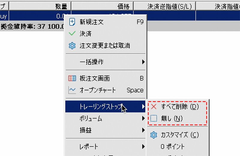 トレーリングストップを終了する場合は、ポジション行の上で右クリックし、「無し」を選択すると、選択した行のポジションのトレーリングストップを解除し、「すべて削除」を選択すると、すべてのポジションに設定しているトレーリングストップを解除します。