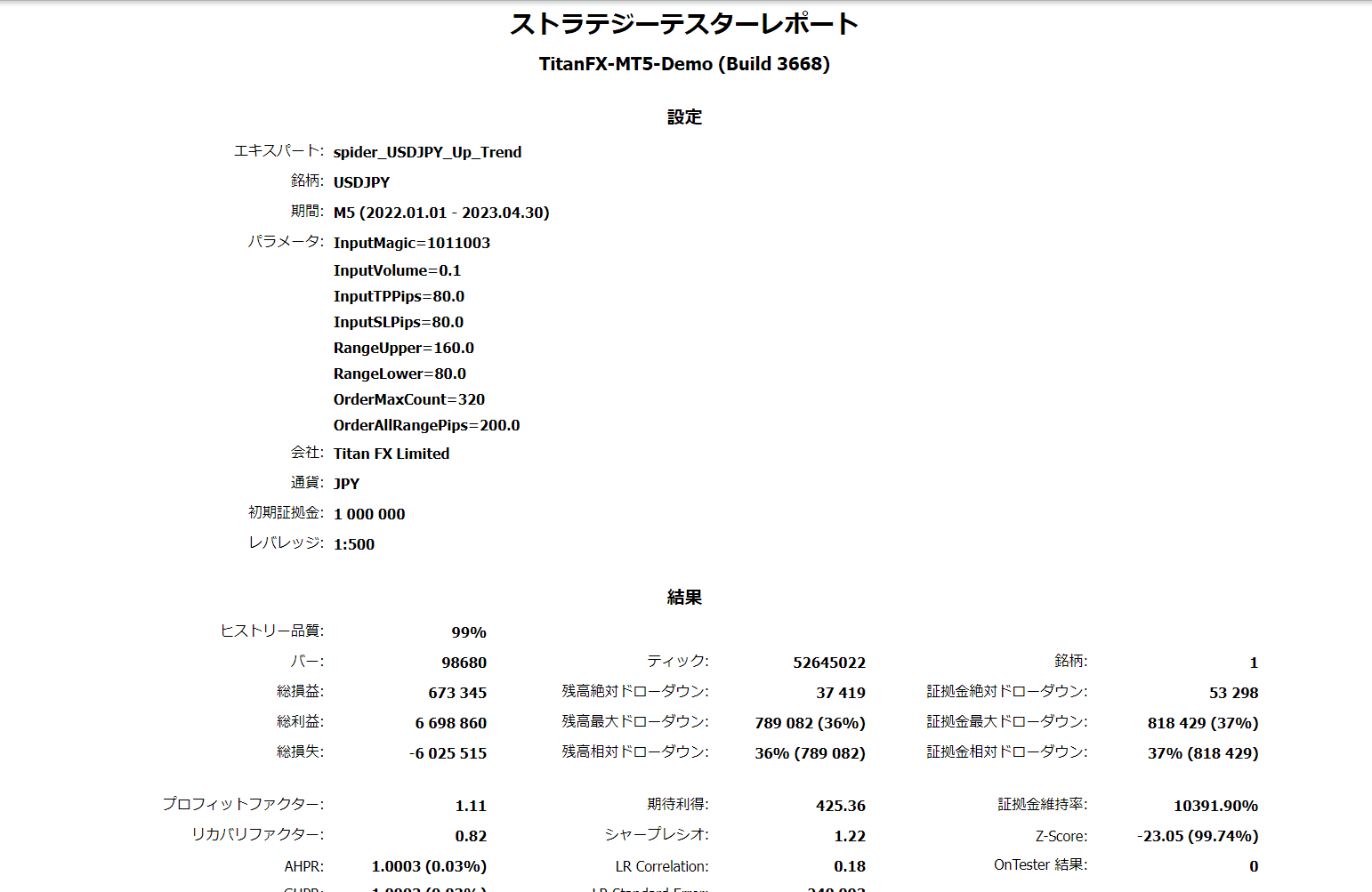 バックテストは単純に設定したパラメーターでテストを行うこともできるほか、時間はかかりますが、最適化のテスト(パラメーターをどの値に設定すると、結果が最適になるかの検証)を行うこともできます。