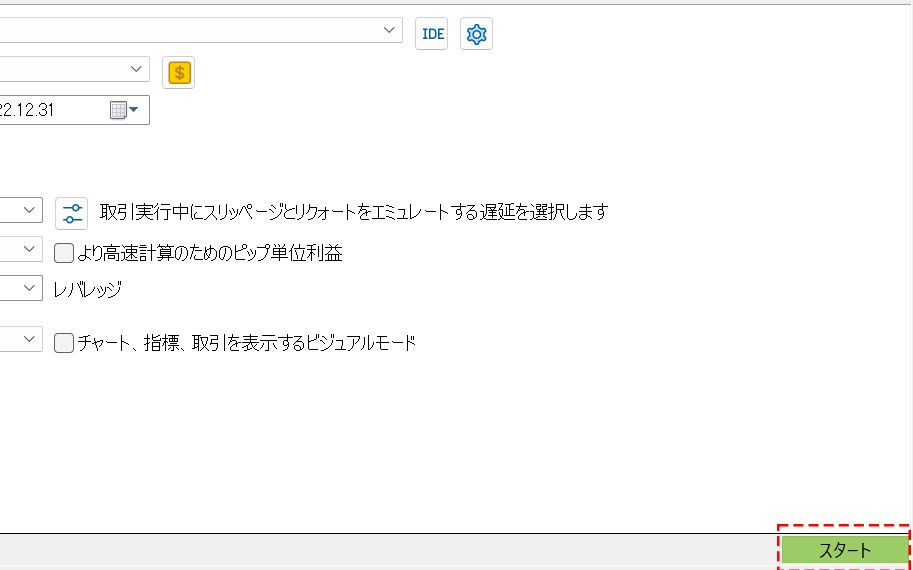 ⑩最適化を行わない場合:取引の経過を見れるビジュアルモードにする場合はチェックを入れます。(ビジュアルモードにすると、テストに時間がかかります。)