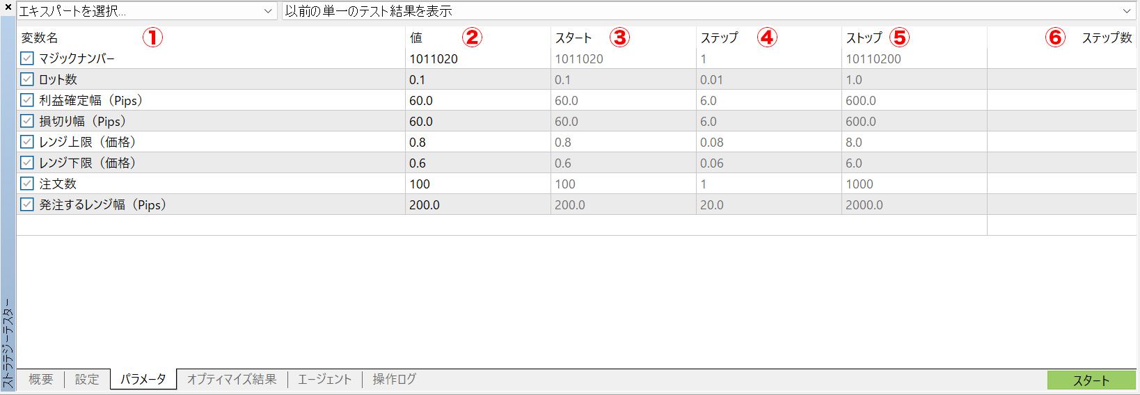 ④最適化を行う際のスタート値からの間隔を指定します。⑤最適化を行う際の最大値を指定します。