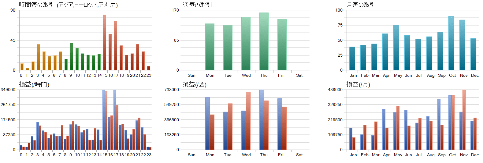 時間帯別の取引回数、損益の傾向をグラフでチェックできます。