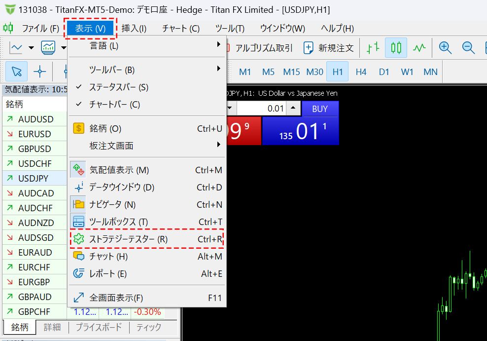 ストラテジーテスターを表示するには、MT5のメニューの「表示」内の「ストラテジーテスター」を選択します。