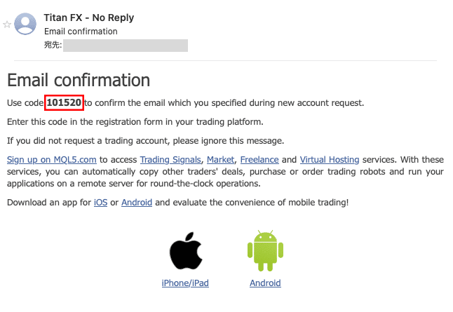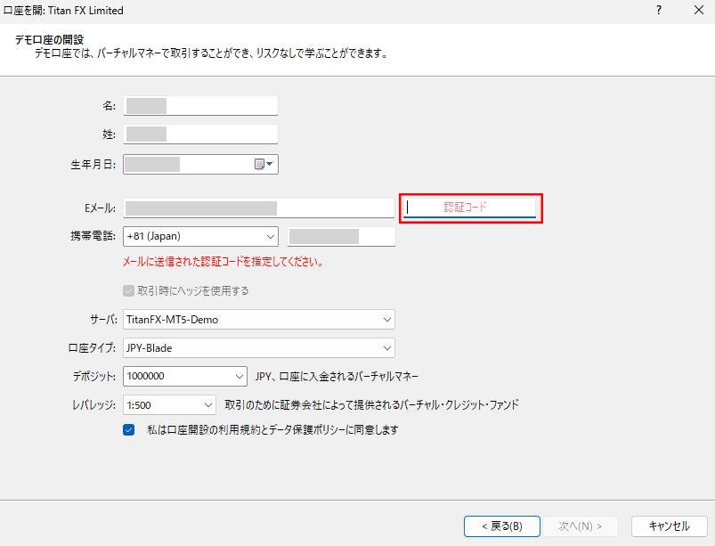 MT5に戻り認証コードの欄に受信した認証コードを入力します。