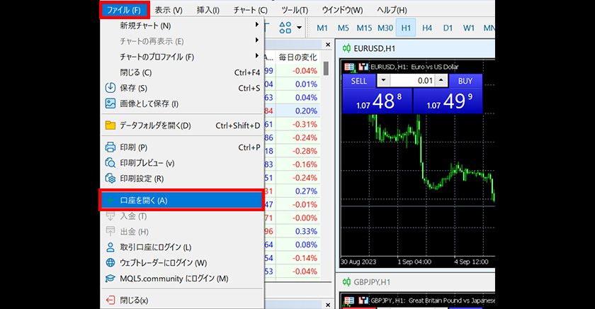 MT5のメニューの「ファイル」から「口座を開く」を選択します。