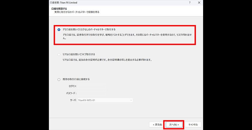 続いて、「デモ口座を開いてリスクなしのバーチャルマネーで取引する」にチェックが入っていることを確認し、「次へ」をクリックします。