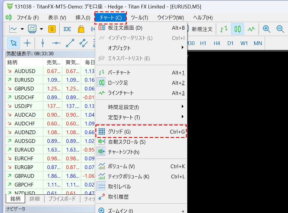MT5のメニューの「チャート」内のグリッドをクリックすると、表示、非表示を切り替えることができます。