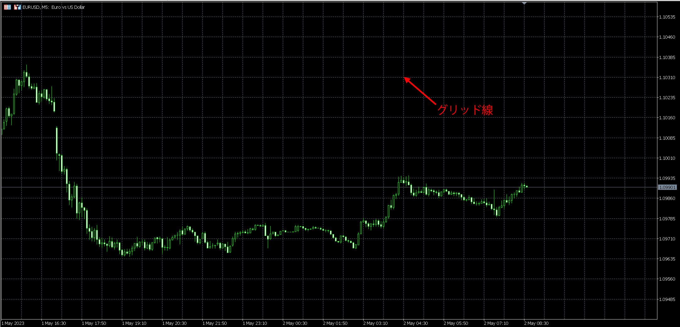 MT5のチャートでは、デフォルトでグリッド線(縦と横の格子状の線)が表示されています。