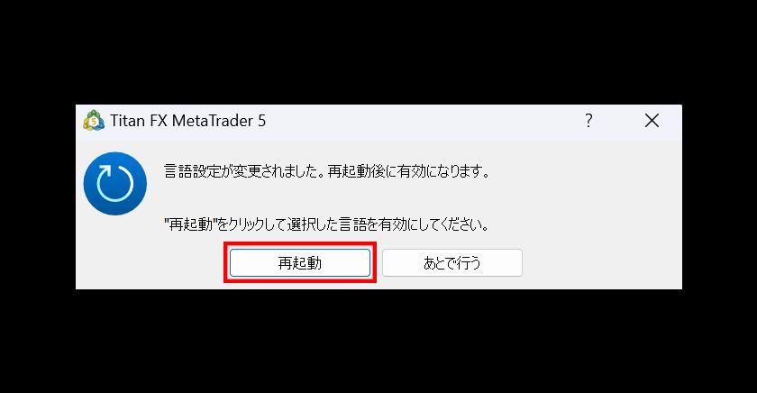 MT5の再起動を促すメッセージが表示されるので、「再起動」をクリックし、再起動を行います。