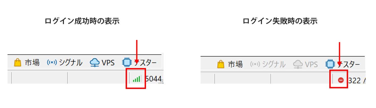 MT5口座へのログインが成功したときは、MT5の右下に緑色のアンテナのマークが表示されます。赤の侵入禁止マークが表示されている場合はログインができていません。