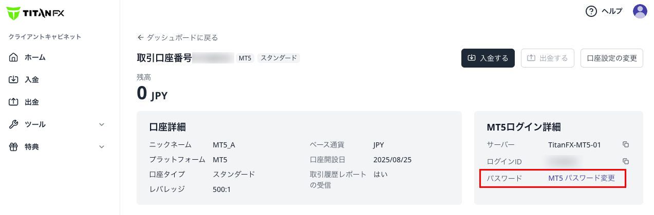 リアル口座の場合は、口座開設時にメール(件名:【重要】Titan FX : MT5口座ログイン情報)で送付されたログイン情報をご確認ください。