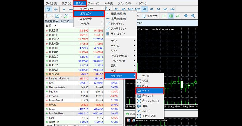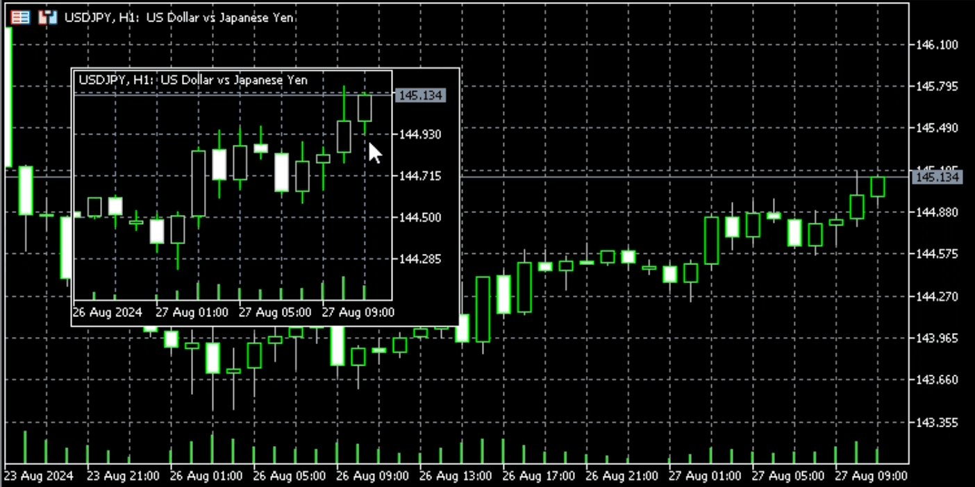 MT5では、チャート上に小さなチャート(ミニチャート)を表示することができます。ミニチャートは銘柄や時間足を変更、複数表示が可能なのでお好みに合わせたカスタマイズが可能です。