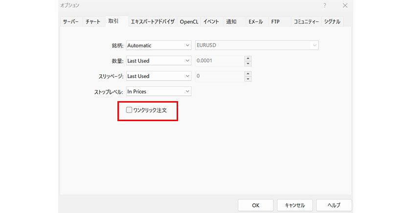 ② オプション画面の一番下の「ワンクリック注文」にチェックを入れます。