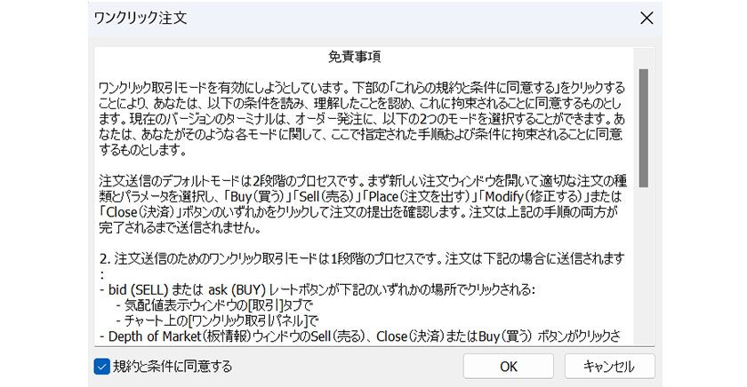 ③ ワンクリック注文の免責事項が表示されるので、内容を確認し、「規約と条件に同意する」にチェックを入れて「OK」をクリックします。