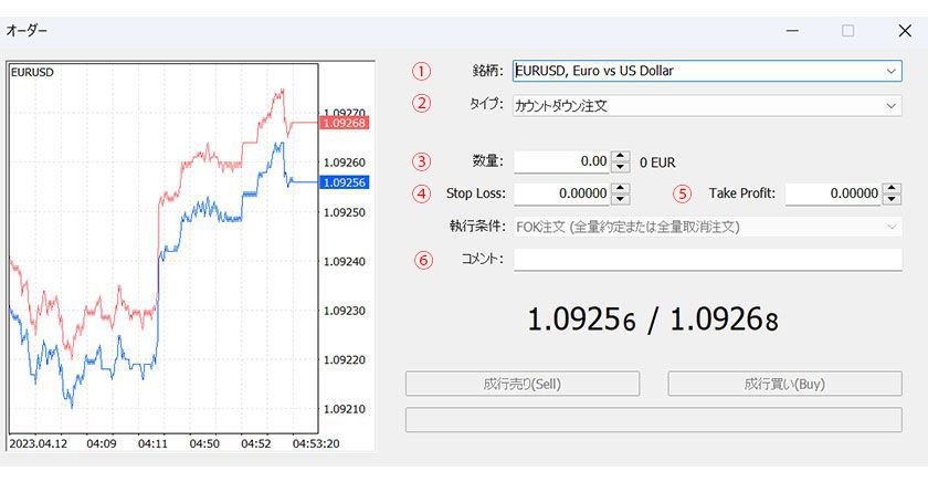 ⑤Take Profit(任意):利益確定注文の水準を指定します。※1