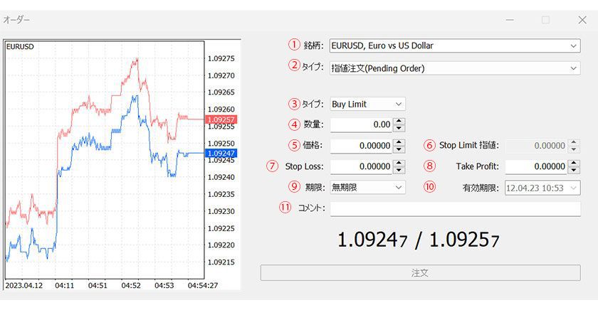 ③タイプ(下段):Buy Limit(買い指値)、Sell Limit(売り指値)、Buy Stop(買い逆指値)、Sell Stop(売り逆指値)、Buy Stop Limit、Sell Stop Limitのいずれかを選択します。