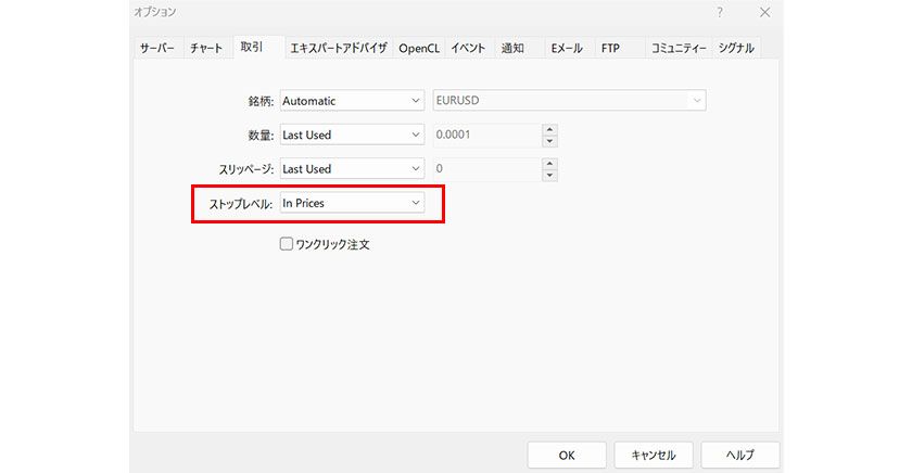 取引のオプション設定の「ストップレベル」を「In Prices」を選択すると価格で指定、「In Points」を選択するとポイント数で指定で指定します。