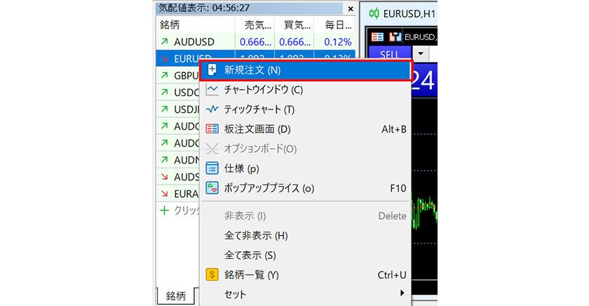 方法② チャート上で右クリックし、表示されるメニューの「プライスボード」内の「新規注文」を選択します。