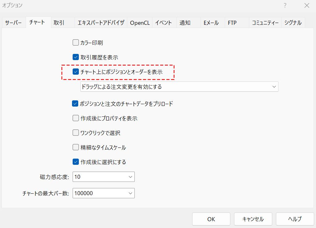 MT5のチャート上のポジション、注文の水準の表示/非表示の切り替えは2箇所で設定を行います。